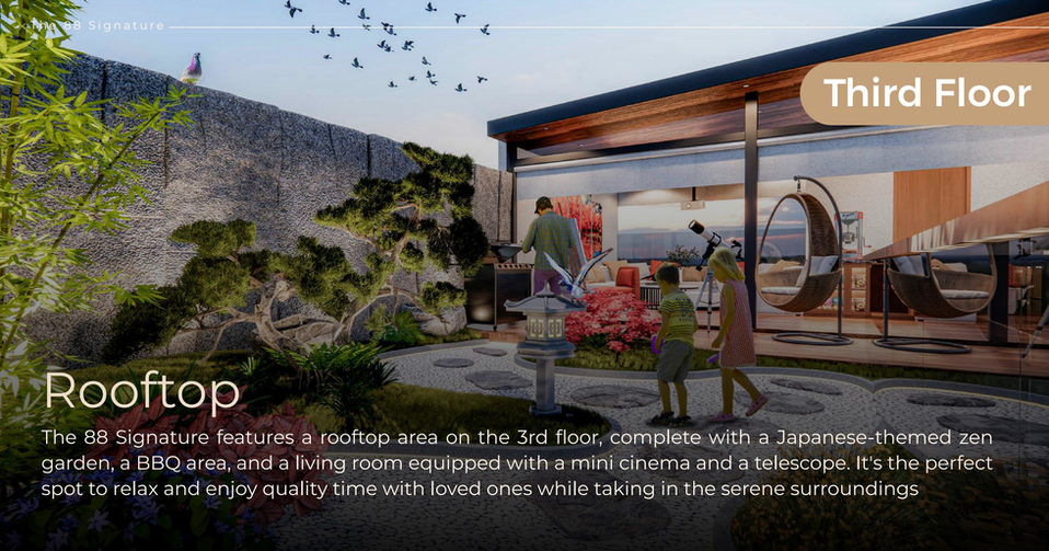 The crowning jewel of each villa is the third-floor rooftop area, featuring a Japanese-inspired zen garden, BBQ facilities, and a living room equipped with a mini cinema and telescope. This unique space offers a serene retreat for enjoying Bali's breathtaking sunsets and surroundings.